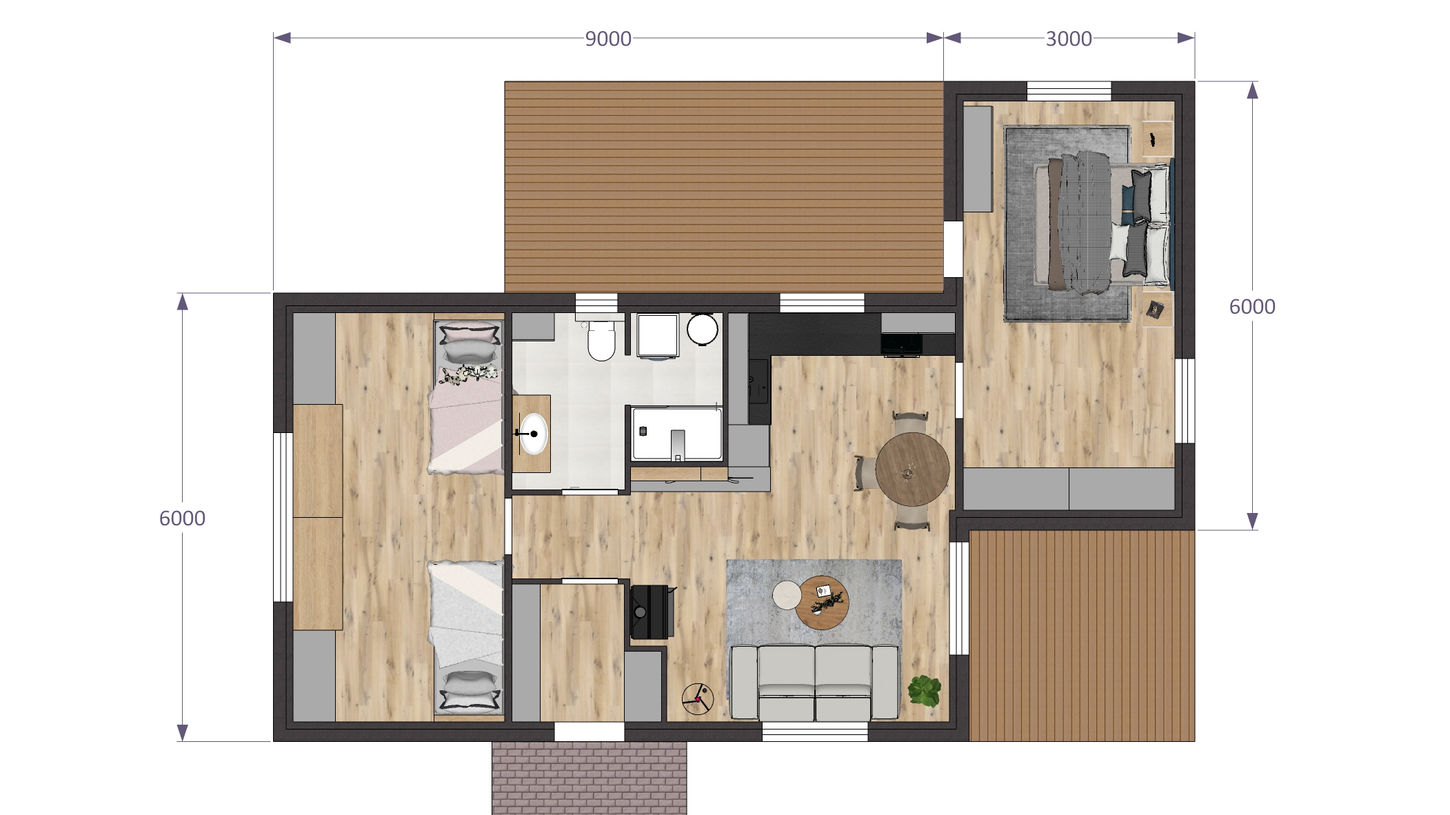 V současné době největší standardní domek v portfoliu naší firmy mimo individuální požadavky. Tento domek je určen k trvalému bydlení, což umožňuje jeho nízkoenergetické technické řešení.